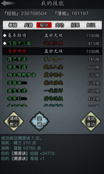 用斧头的玩家可以尝试铁掌帮助,轩辕斧法有三种主动技能,可以控制和攻击。前期几乎没有对手,但后期发展会有限,所以更适合短期高强度突破。如果你决定转到武当,玩家应该确保你角色的正气值达到标准。而且武当只接受男性弟子,所以转世前最好节省足够的资源,重置和培养技能需要大量的投入,第二,选择学校要看自己的武器类型和属性,选对了才能让后续的突破和成长更容易。
