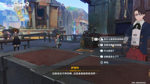 6、接取任务:有奈芙尔直接使用E技能接取;没有奈芙尔,与老板对话,选择第一个选项,将投资券全买了,再次对话选择第二个选项。